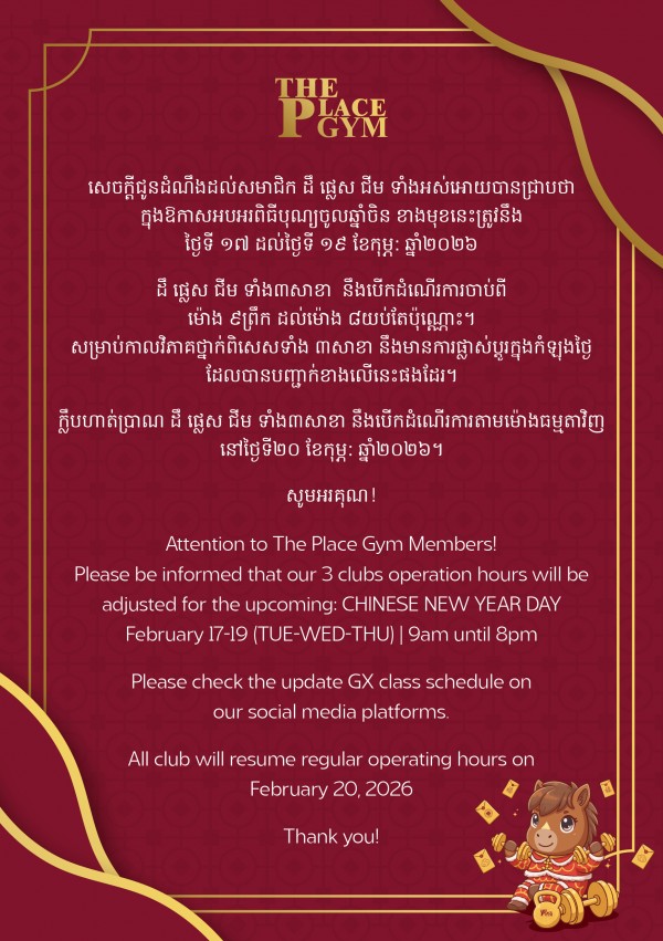 ដឹ ផ្លេស ជីម ទាំង៣សាខា នឹងបើកដំណើរការចាប់ពីម៉ោង ៩ព្រឹក ដល់ម៉ោង ៨យប់តែប៉ុណ្ណោះ។